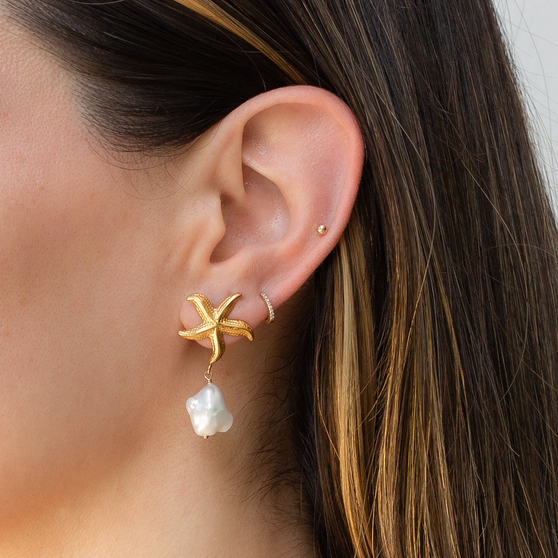 Make waves with our 18k Stainless Steel Starfish Earrings, complete with a freshwater baroque pearl drop. Playful meets polished in this ocean-inspired piece, with unique pearls that keep things effortlessly cool. Whether you're dressing up or down, these beauties bring a touch of seaside charm to your everyday vibe.